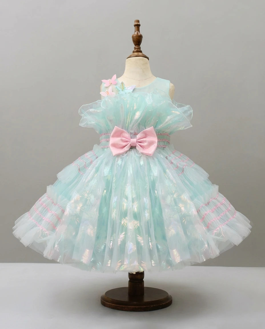 Mint Butterfly Embellished Layered Tulle Dress | Cold Shoulder Party Wear for Baby Girls | Sana Mythic