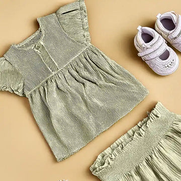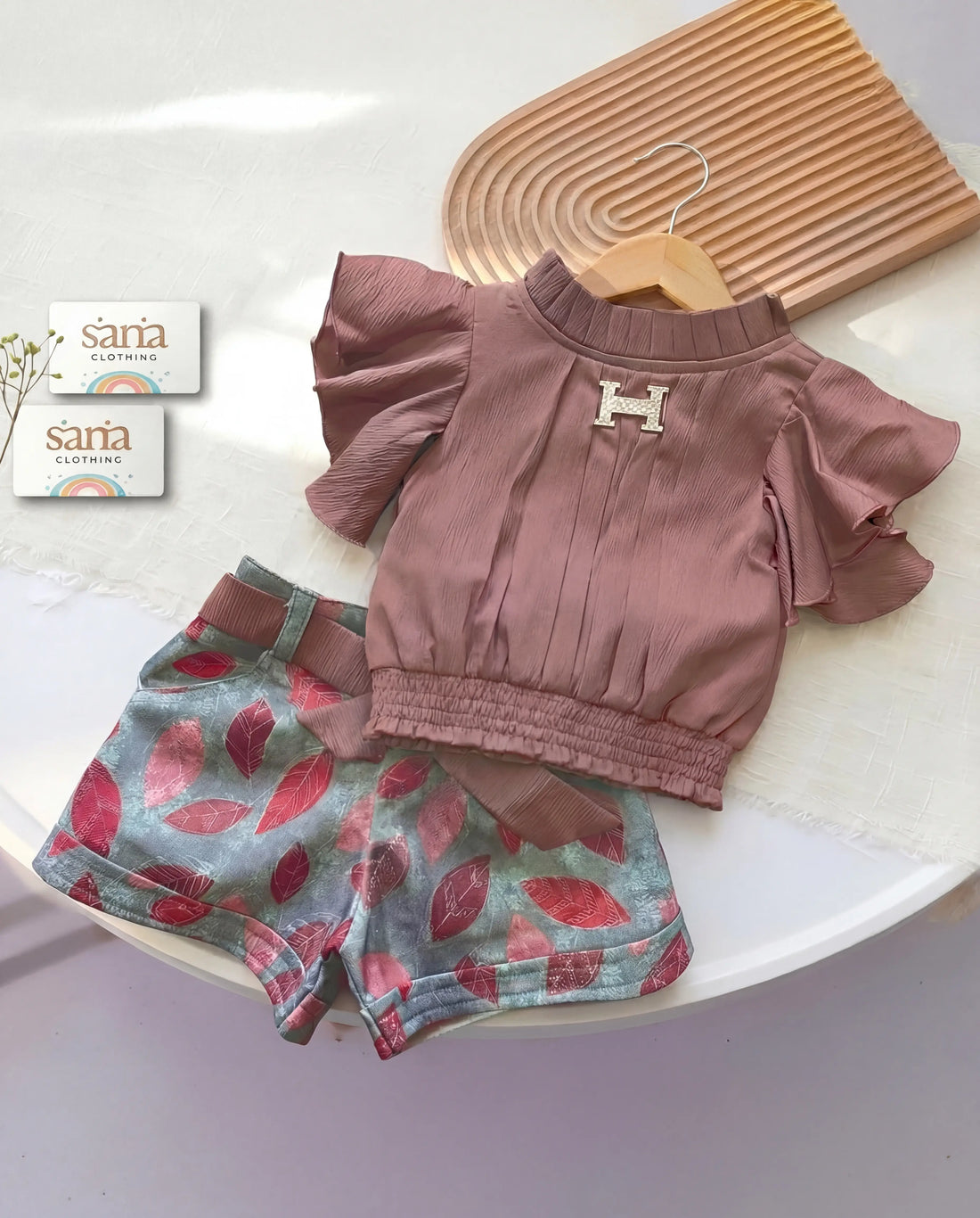 Misty Rose Ruffle Top with Leaf Print Shorts Set for Baby Girls | Sana Clothing
