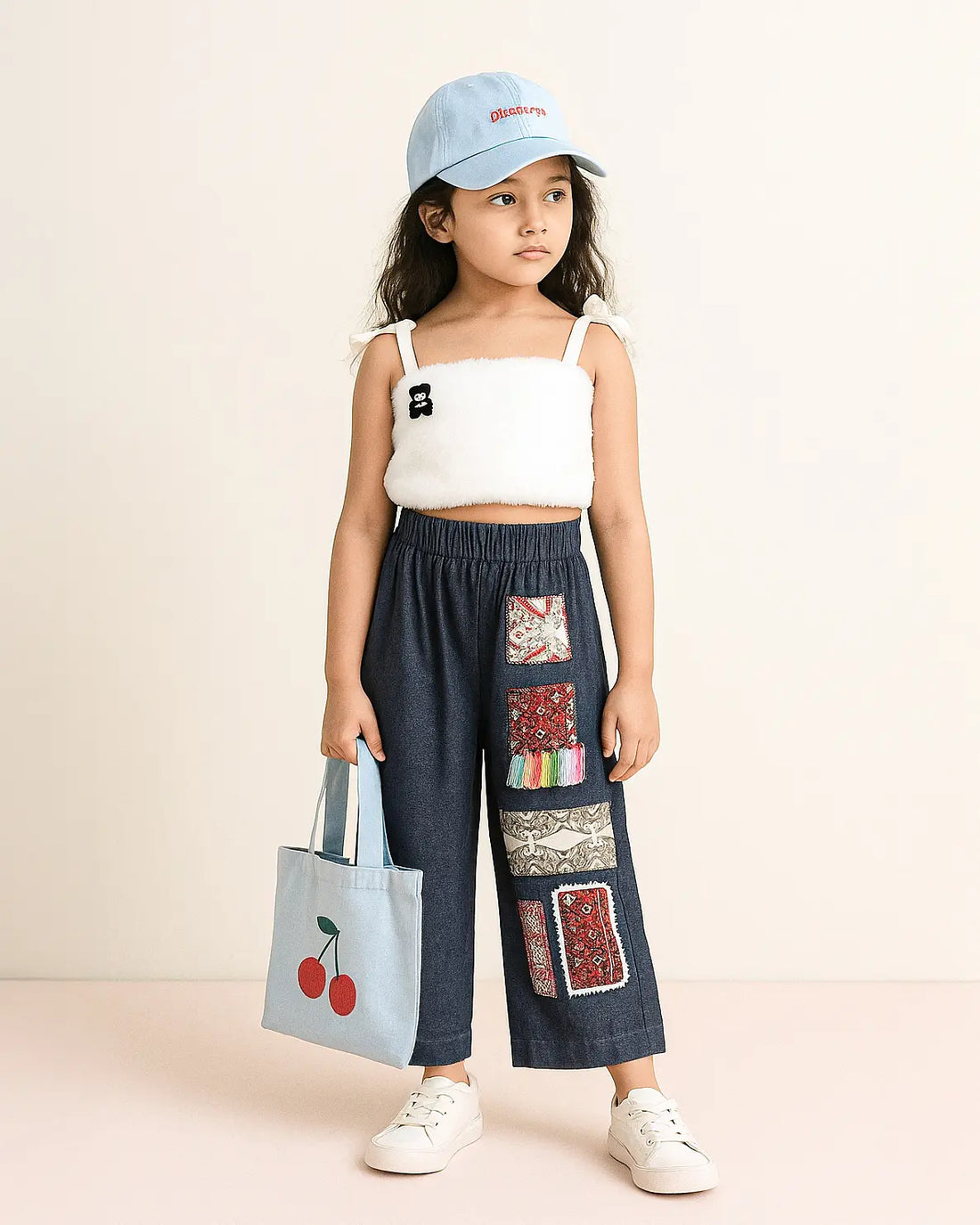 White Faux Fur Crop Top & Denim Patchwork Wide-Leg Pants Set for Girls | Sana Clothing