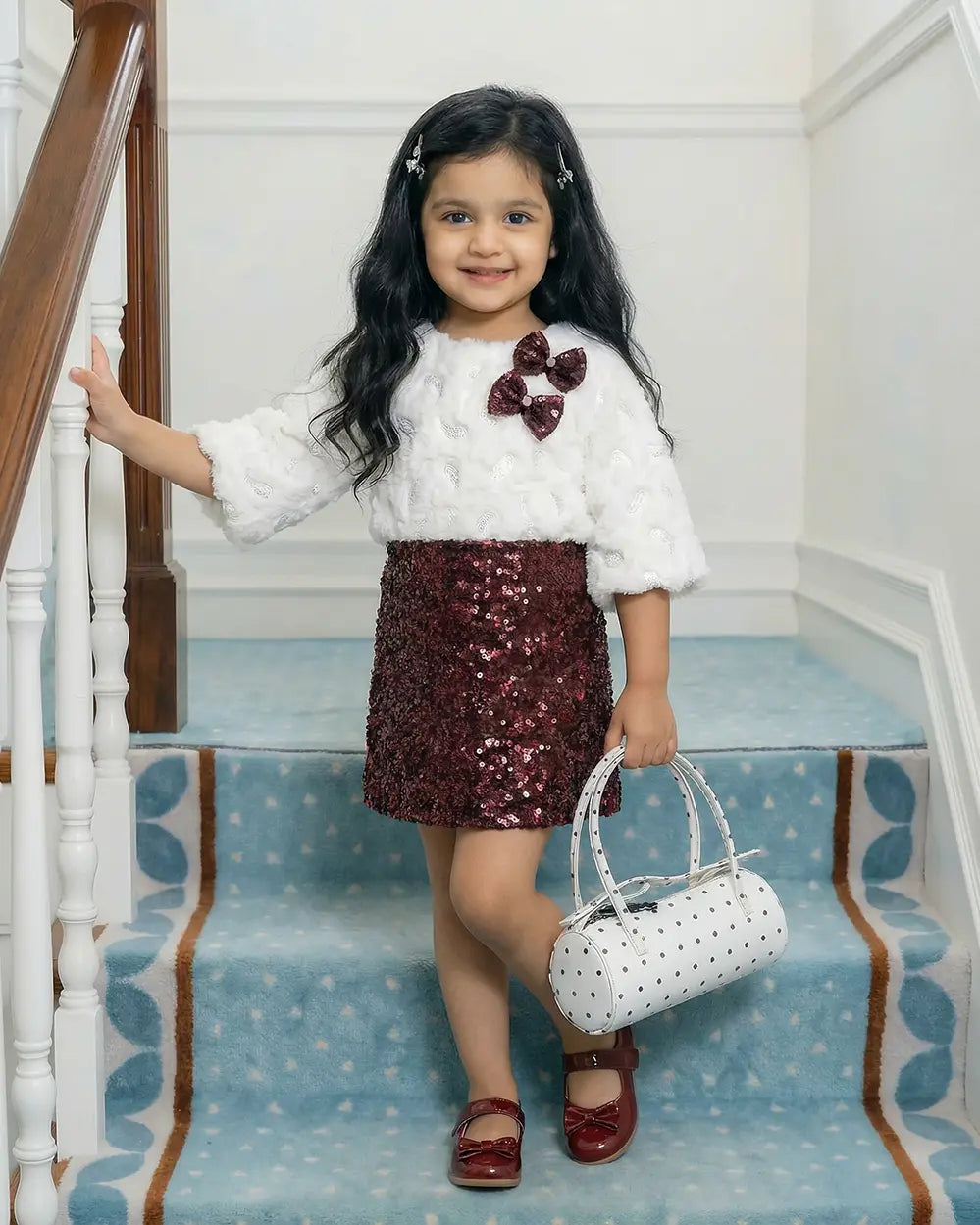 Maroon Sequin Shift Dress & Soft Fur Overlay Set – Baby & Girls Party Wear | Sana Clothing