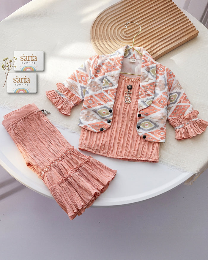 Girls Ikat Jacket & Pleated Top & Pants Co-ord Set | Sana Clothing