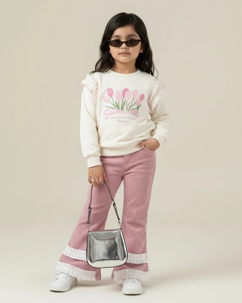 Girls Tulip Print Sweatshirt & Pink Flared Pants Co-ord Set | Sana Clothing
